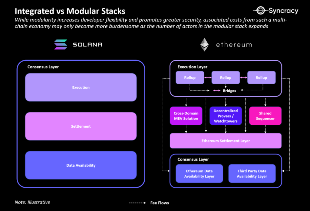 Transitioning from a monolithic chain to a modular setup can be complex, involving the migration and reconnection of settlement, bridging, custody, and execution components to fit the new architecture.